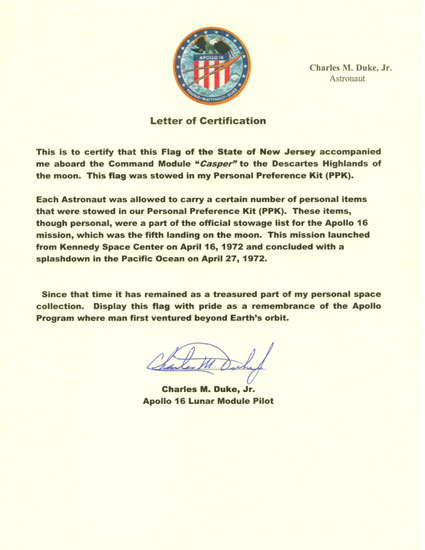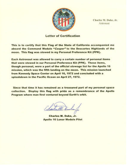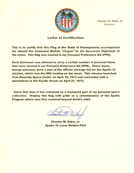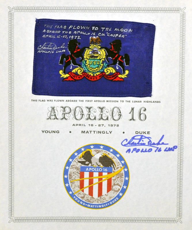 Farthest Reaches is pleased to offer artifacts for sale from the personal collection of Brigadier General, Astronaut and Moon Walker Charles Duke. Having flown as the Lunar Module Pilot on Apollo 16 and having the honor of being the 10th man to walk on the moon, Charlie has been able to acquire a number of space related mementos spanning his years at NASA and beyond. To that end, he has entrusted Farthest Reaches to make available to collectors worldwide, selected items from his collection that will be posted below as they become available. We invite you to stop back from time to time as you just never know what unique treasures may suddenly appear. We also invite you to visit the Apollo 16 autograph page for a fine selection of authentically signed photographs by General Duke and his crewmates on Apollo 16.