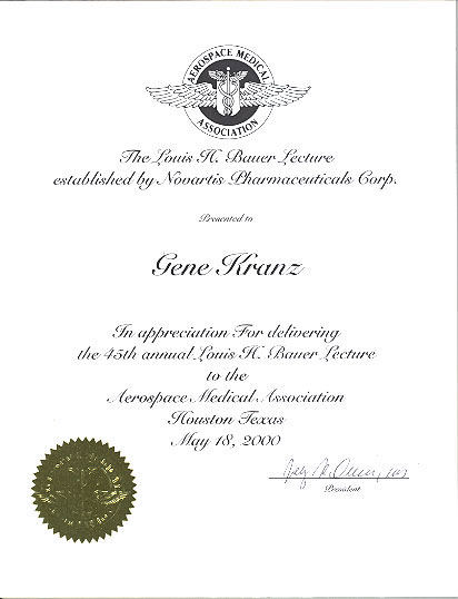 As a NASA Flight Director Gene served as successor to NASA founding Flight Director Chris Kraft, during the Gemini and Apollo programs, and is best known for his role in directing the successful Mission Control team efforts to save the crew of Apollo 13, which later became the subject story of a major motion picture of the same name. Gene was played by actor Ed Harris. He is also noted for his trademark close-cut flattop hairstyle, and the wearing of dapper white "mission" vests (waistcoats), of different styles and materials made by his wife, Marta Kranz, during missions for which he acted as Flight Director. Eugene Kranz is a prominent and colorful figure in the history of U.S. manned space exploration, the embodiment of "NASA tough-and-competent" of the Kranz Dictum. Kranz has been the subject of movies, documentary films, and books and periodical articles. Kranz is a recipient of a Presidential Medal of Freedom. In a 2010 Space Foundation survey, Kranz was ranked as the #2 most popular space hero.