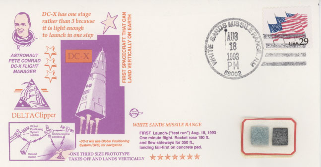 This DC-X maiden flight cover has two authentic flown pieces of Delta Clipper aero shell material affixed to it.  The material was obtained by Major Dale E. Shell who served as the DC-X & DC-XA Deputy Director for Flight Tests.