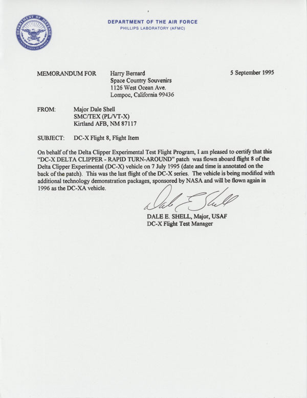 Accompanied by a 1995 memo from Dale Shell, the DC-X Flight test Manager stating, in part: “I am pleased to certify that this ‘DC-X Delta Clipper - Rapid Turn-Around’ patch was flown aboard flight 8 of the Delta Clipper Experimental…vehicle on 7 July 1995.”