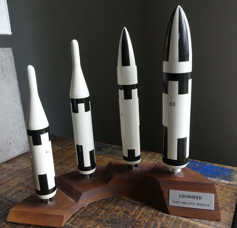 This is a table top Lockeed: Fleet Ballistic Missiles contractors model.  From left to right are the A1 (9.25"), A2 (10"), A3 (10.25") and C3 (10.75") missiles.  In outstanding condition mounted on wood base as shown in photo.