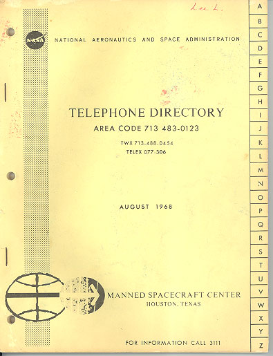 An early who's who phone directory from the Manned Spacecraft Center in Houston. Contains 78 pages of contact information.  Very interesting associational item.