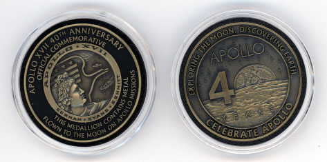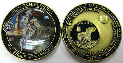 This official NASA medallion contains metal from the Command Module that flew the first men who walked on the moon 1969-2014. It is an immpressive  1.75" in diameter.  Both sides are shown in the accompanying image.