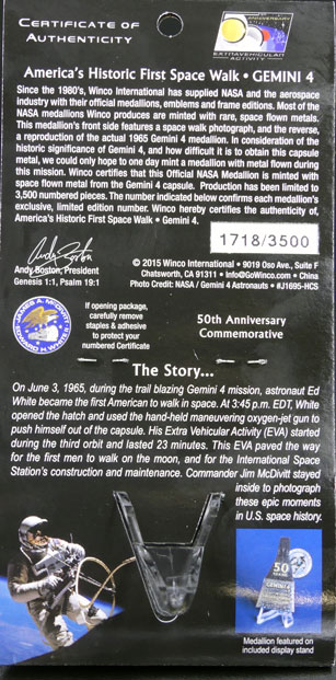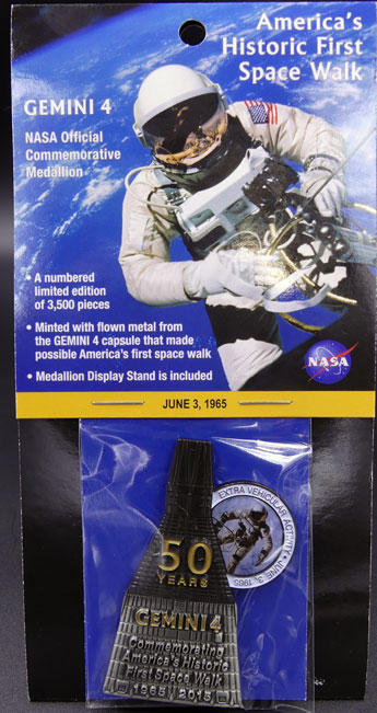 This commemorative medallion contains metal flown on Gemini 4.  The production run was limited to only 3500 pieces worldwide.  This medallion comes with a certificate of authenticity and a plastic display stand.