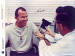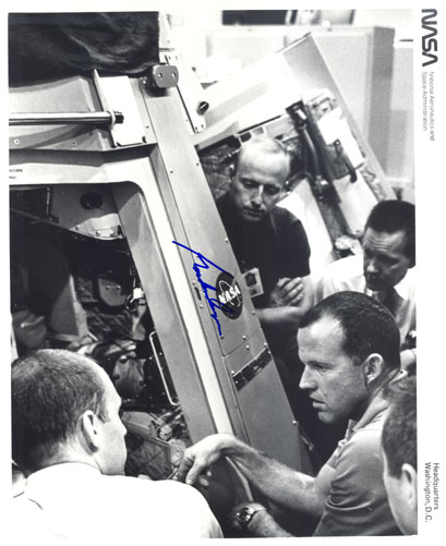 NASA press release glossy showing Gordo and Pete Conrad inspecting their craft prior to the mission itself. Perfect condition. Hand signed by Gordo neatly in blue sharpie.