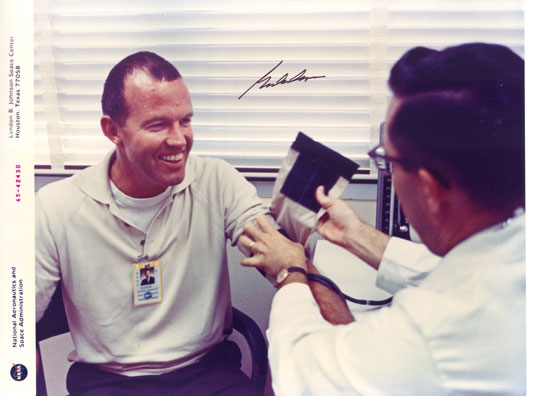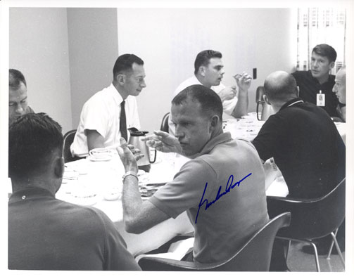 Vintage NASA press release glossy showing Gordo meeting to discuss his upcoming mission. You may recognize Deke Slayton, John Young, Wally Schirra, Pete Conrad and Tom Stafford also at the table with Gordo. Pristine condition and neatly hand signed by Gordon Cooper in blue sharpie.