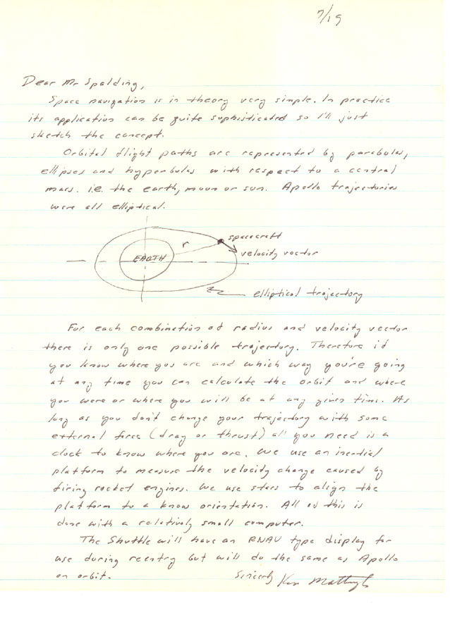A beautiful full page hand written letter with amazing content. Discusses the Space Shuttle relative to space navigation. I have enlarged this scan so that Mattingly's words might speak for themselves. An exceptional letter from this Apollo and Space Shuttle Astronaut.