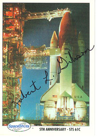 Autographed Space Shot card #0153 showing STS 61-C on launch pad.