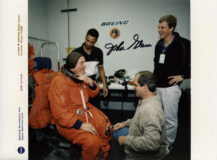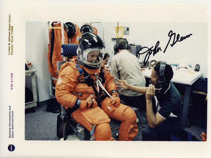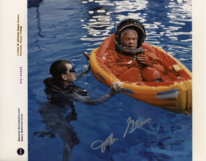 Beautiful SP hand signed by John Glenn shows him training for STS-95. This is an official NASA press release photo (8x10)